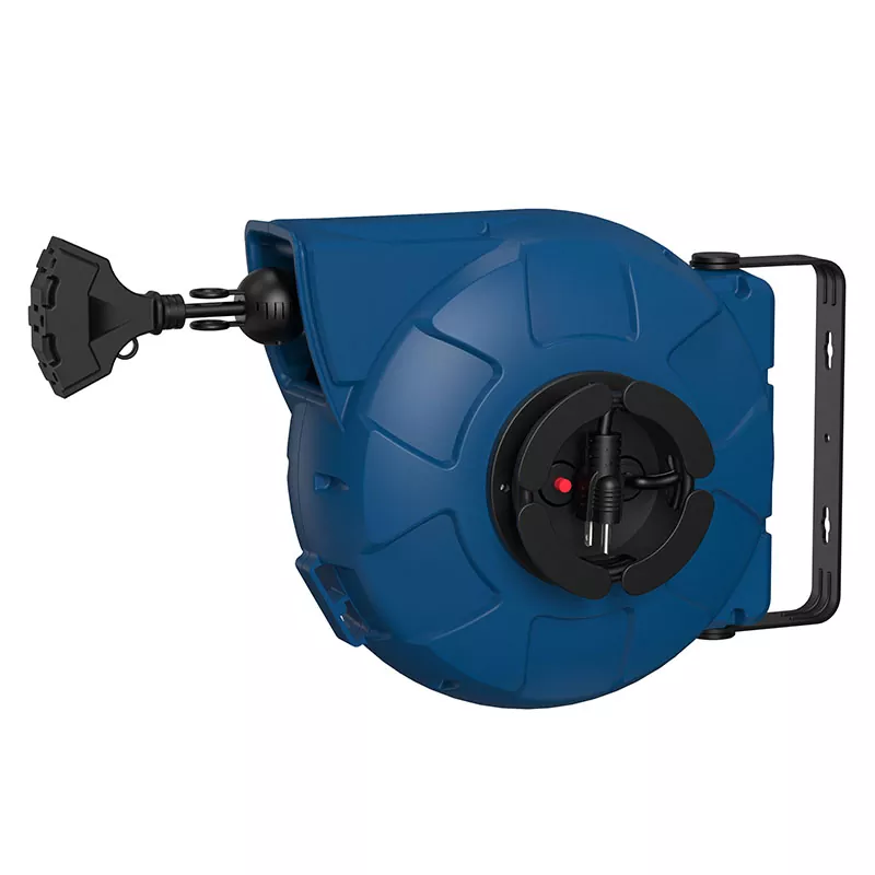 Staffa in acciaio per il montaggio a parete, alloggiamento in plastica robusta e manico pratico di trasporto: la bobina del cavo elettrico è l'estensione del cavo ideale.